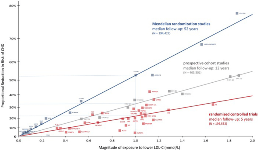 Mendelian randomization studies show that when LDL is lower from the very beginning, the benefits accumulate year after year, leading to a dramatically lower lifetime risk of heart disease.