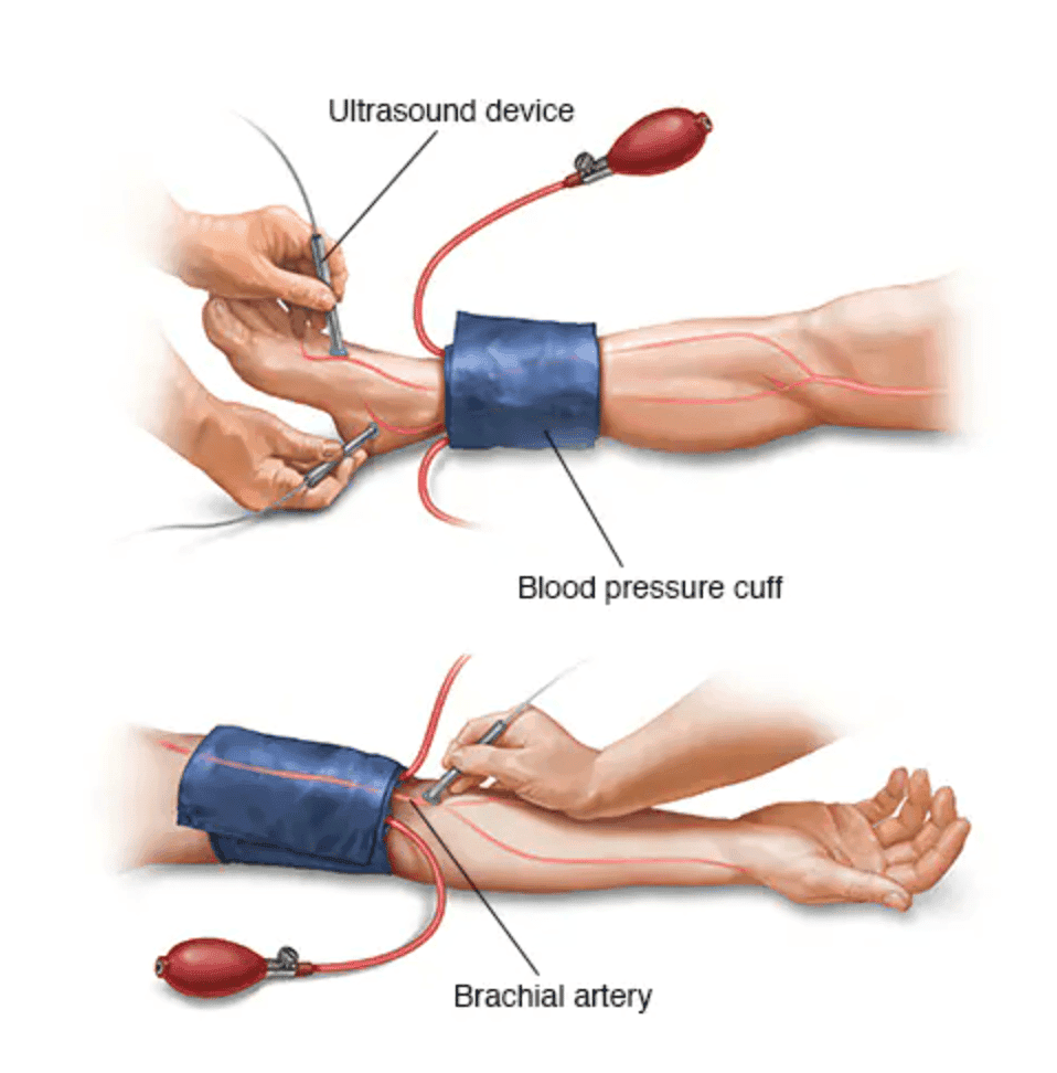Blood pressure cuffs are placed on both arms and ankles, and the test takes about 10-15 minutes to complete.